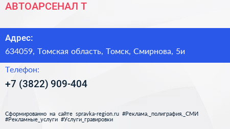 АВТОАРСЕНАЛ-Т по адресу 634059, Томская область, Томск, Смирнова, 5и в дальнейшем Организация, размещена в следующих категориях: