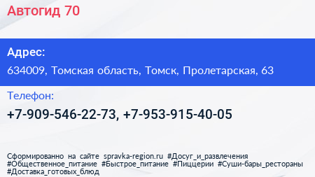 Автогид 70 по адресу 634009, Томская область, Томск, Пролетарская, 63 в дальнейшем Организация, размещена в следующих категориях: