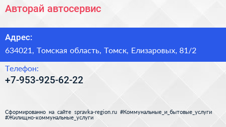 Авторай, автосервис по адресу 634021, Томская область, Томск, Елизаровых, 81/2 в дальнейшем Организация, размещена в следующих категориях: