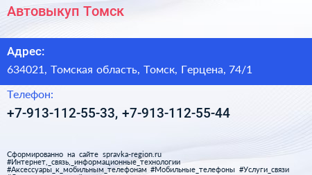 Автовыкуп Томск по адресу 634021, Томская область, Томск, Герцена, 74/1 в дальнейшем Организация, размещена в следующих категориях: