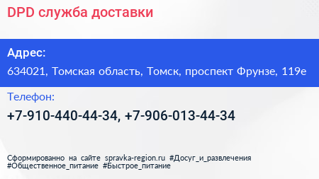 DPD, служба доставки по адресу 634021, Томская область, Томск, проспект Фрунзе, 119е в дальнейшем Организация, размещена в следующих категориях: