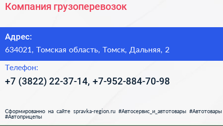 Компания грузоперевозок по адресу 634021, Томская область, Томск, Дальняя, 2 в дальнейшем Организация, размещена в следующих категориях: