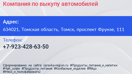 Компания по выкупу автомобилей по адресу 634021, Томская область, Томск, проспект Фрунзе, 111 в дальнейшем Организация, размещена в следующих категориях: