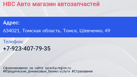 НВС-Авто, магазин автозапчастей по адресу 634021, Томская область, Томск, Шевченко, 49 в дальнейшем Организация, размещена в следующих категориях: