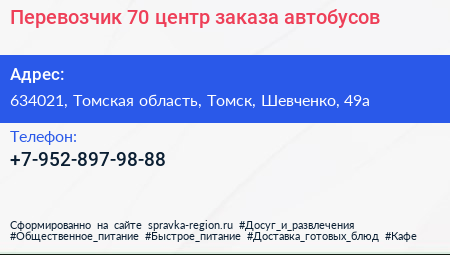Перевозчик 70, центр заказа автобусов по адресу 634021, Томская область, Томск, Шевченко, 49а в дальнейшем Организация, размещена в следующих категориях: