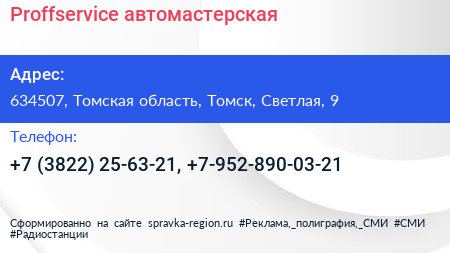 Proffservice, автомастерская по адресу 634507, Томская область, Томск, Светлая, 9 в дальнейшем Организация, размещена в следующих категориях: