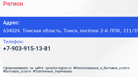 Регион по адресу 634024, Томская область, Томск, посёлок 2-й ЛПК, 111/35 в дальнейшем Организация, размещена в следующих категориях: