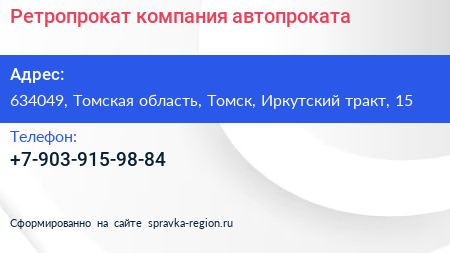 Ретропрокат, компания автопроката по адресу 634049, Томская область, Томск, Иркутский тракт, 15 в дальнейшем Организация, размещена в следующих категориях: