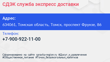 СДЭК, служба экспресс-доставки по адресу 634061, Томская область, Томск, проспект Фрунзе, 86 в дальнейшем Организация, размещена в следующих категориях: