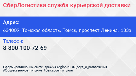 СберЛогистика, служба курьерской доставки по адресу 634009, Томская область, Томск, проспект Ленина, 133а в дальнейшем Организация, размещена в следующих категориях:
