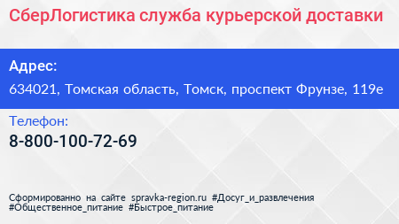 СберЛогистика, служба курьерской доставки по адресу 634021, Томская область, Томск, проспект Фрунзе, 119е в дальнейшем Организация, размещена в следующих категориях: