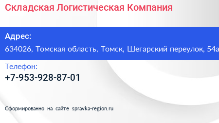 Складская Логистическая Компания по адресу 634026, Томская область, Томск, Шегарский переулок, 54а в дальнейшем Организация, размещена в следующих категориях: