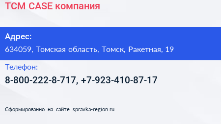 ТСМ CASE, компания по адресу 634059, Томская область, Томск, Ракетная, 19 в дальнейшем Организация, размещена в следующих категориях: