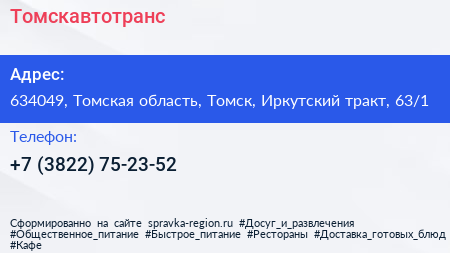 Томскавтотранс по адресу 634049, Томская область, Томск, Иркутский тракт, 63/1 в дальнейшем Организация, размещена в следующих категориях: