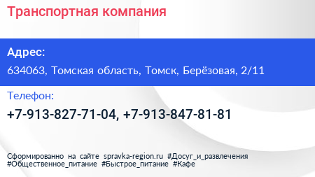 Транспортная компания по адресу 634063, Томская область, Томск, Берёзовая, 2/11 в дальнейшем Организация, размещена в следующих категориях: