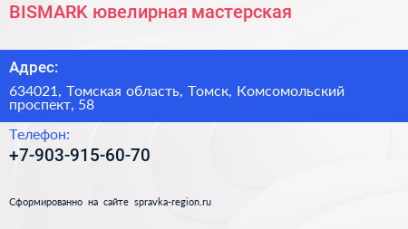 BISMARK, ювелирная мастерская по адресу 634021, Томская область, Томск, Комсомольский проспект, 58 в дальнейшем Организация, размещена в следующих категориях: