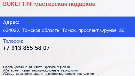 BUKETTINI, мастерская подарков по адресу 634029, Томская область, Томск, проспект Фрунзе, 26 в дальнейшем Организация, размещена в следующих категориях: