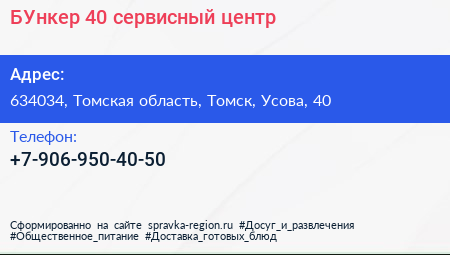 БУнкер 40, сервисный центр по адресу 634034, Томская область, Томск, Усова, 40 в дальнейшем Организация, размещена в следующих категориях: