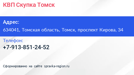КВП Скупка Томск по адресу 634041, Томская область, Томск, проспект Кирова, 34 в дальнейшем Организация, размещена в следующих категориях: