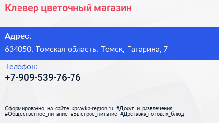Клевер, цветочный магазин по адресу 634050, Томская область, Томск, Гагарина, 7 в дальнейшем Организация, размещена в следующих категориях: