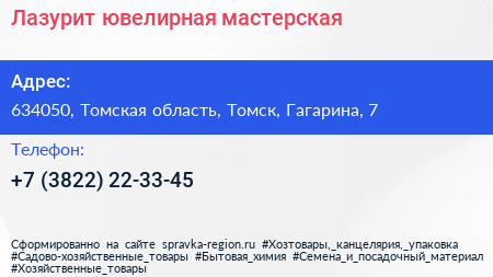 Лазурит, ювелирная мастерская по адресу 634050, Томская область, Томск, Гагарина, 7 в дальнейшем Организация, размещена в следующих категориях:
