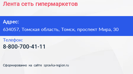 Лента, сеть гипермаркетов по адресу 634057, Томская область, Томск, проспект Мира, 30 в дальнейшем Организация, размещена в следующих категориях: