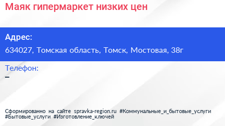 Маяк, гипермаркет низких цен по адресу 634027, Томская область, Томск, Мостовая, 38г в дальнейшем Организация, размещена в следующих категориях: