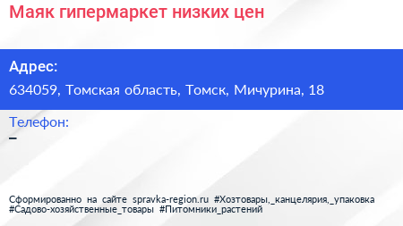 Маяк, гипермаркет низких цен по адресу 634059, Томская область, Томск, Мичурина, 18 в дальнейшем Организация, размещена в следующих категориях: