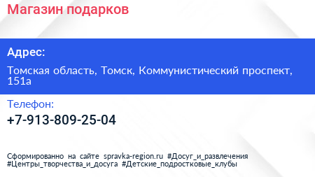 Магазин подарков по адресу Томская область, Томск, Коммунистический проспект, 151а в дальнейшем Организация, размещена в следующих категориях: