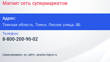 Магнит, сеть супермаркетов по адресу Томская область, Томск, Лесная улица, 8Б в дальнейшем Организация, размещена в следующих категориях:
