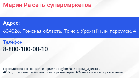 Мария-Ра, сеть супермаркетов по адресу 634026, Томская область, Томск, Урожайный переулок, 4 в дальнейшем Организация, размещена в следующих категориях:
