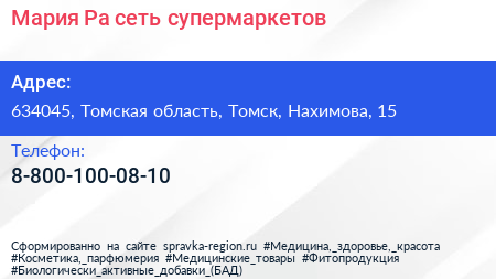 Мария-Ра, сеть супермаркетов по адресу 634045, Томская область, Томск, Нахимова, 15 в дальнейшем Организация, размещена в следующих категориях: