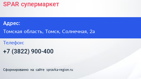 SPAR, супермаркет по адресу Томская область, Томск, Солнечная, 2а в дальнейшем Организация, размещена в следующих категориях:
