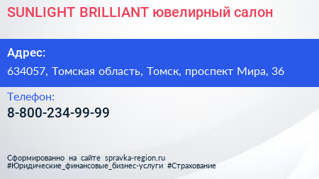 SUNLIGHT BRILLIANT, ювелирный салон по адресу 634057, Томская область, Томск, проспект Мира, 36 в дальнейшем Организация, размещена в следующих категориях: