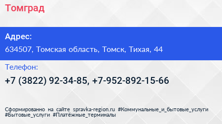 Томград по адресу 634507, Томская область, Томск, Тихая, 44 в дальнейшем Организация, размещена в следующих категориях:
