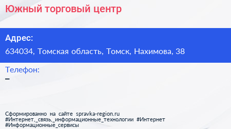 Южный, торговый центр по адресу 634034, Томская область, Томск, Нахимова, 38 в дальнейшем Организация, размещена в следующих категориях: