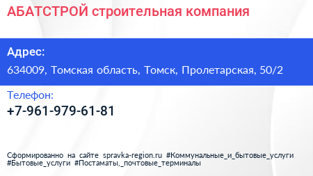 АБАТСТРОЙ, строительная компания по адресу 634009, Томская область, Томск, Пролетарская, 50/2 в дальнейшем Организация, размещена в следующих категориях: