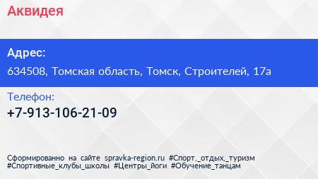 Аквидея по адресу 634508, Томская область, Томск, Строителей, 17а в дальнейшем Организация, размещена в следующих категориях: