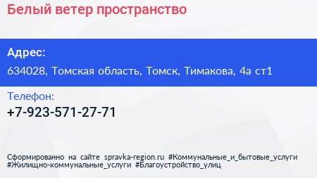 Белый ветер, пространство по адресу 634028, Томская область, Томск, Тимакова, 4а ст1 в дальнейшем Организация, размещена в следующих категориях: