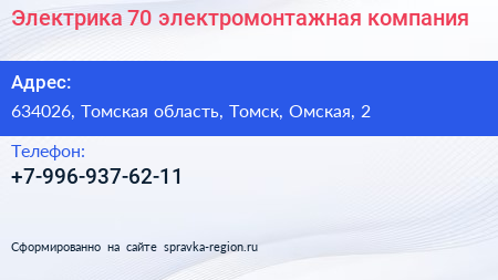 Электрика-70, электромонтажная компания по адресу 634026, Томская область, Томск, Омская, 2 в дальнейшем Организация, размещена в следующих категориях: