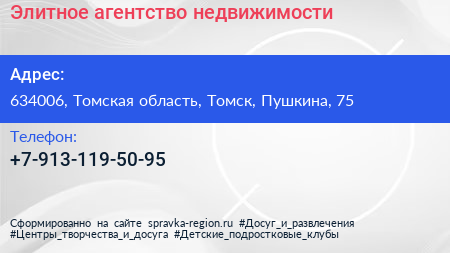 Элитное, агентство недвижимости по адресу 634006, Томская область, Томск, Пушкина, 75 в дальнейшем Организация, размещена в следующих категориях: