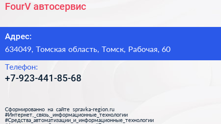 FourV, автосервис по адресу 634049, Томская область, Томск, Рабочая, 60 в дальнейшем Организация, размещена в следующих категориях: