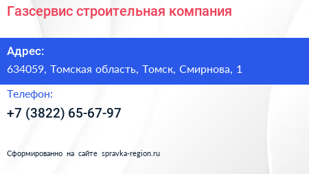 Газсервис, строительная компания по адресу 634059, Томская область, Томск, Смирнова, 1 в дальнейшем Организация, размещена в следующих категориях: