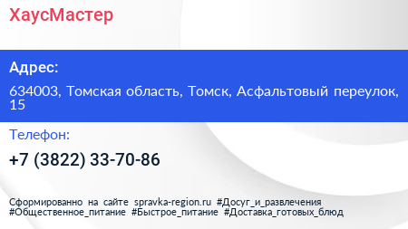 ХаусМастер по адресу 634003, Томская область, Томск, Асфальтовый переулок, 15 в дальнейшем Организация, размещена в следующих категориях: