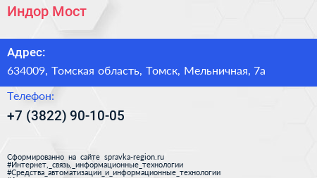 Индор-Мост по адресу 634009, Томская область, Томск, Мельничная, 7а в дальнейшем Организация, размещена в следующих категориях: