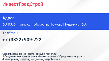 ИнвестГрадСтрой по адресу 634006, Томская область, Томск, Пушкина, 63г в дальнейшем Организация, размещена в следующих категориях: