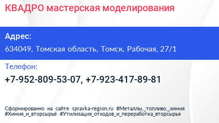 КВАДРО, мастерская моделирования по адресу 634049, Томская область, Томск, Рабочая, 27/1 в дальнейшем Организация, размещена в следующих категориях: