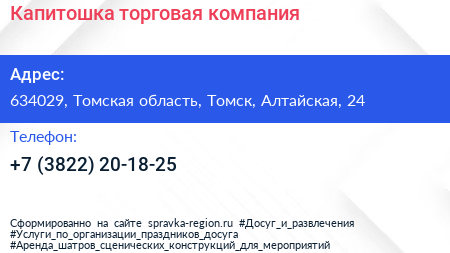 Капитошка, торговая компания по адресу 634029, Томская область, Томск, Алтайская, 24 в дальнейшем Организация, размещена в следующих категориях: