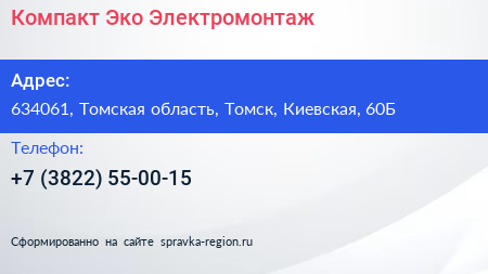 Компакт-Эко-Электромонтаж по адресу 634061, Томская область, Томск, Киевская, 60Б в дальнейшем Организация, размещена в следующих категориях: