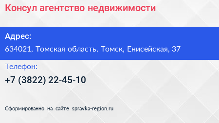 Консул, агентство недвижимости по адресу 634021, Томская область, Томск, Енисейская, 37 в дальнейшем Организация, размещена в следующих категориях:
